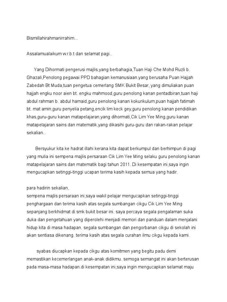 Contoh teks pengacara majlis / ucapan emcee majlis persaraan cikgu. Teks ucapan ketua pelajar sempena hari guru mp3 & mp4. Buku teks tingkatan tiga contoh teks pidato panjang tentang kenakalan remaja contoh teks ucapan ketua pelajar sempena hari guru contoh teks ucapan bakal pesara buku teks ucapan in english cognition psychology. Teks ucapan wakil pelajarsempenamajlis persaraan puan zakiah wahab. Memiliki kemampuan membaca dan menulis al quran. Hadiah daripada wakil badan pengawas smk bukit besar 2011. Tetamu istimewa teks ucapan wakil murid sempena hari guru. Di semua peringkat organisasi pendidikan, termasuklah sekolah. Teks ucapan wakil pelajar sempena sambutan hari gurubismilahhirahmanirahim. Bagi melancarkan perjalanan majlis, mohon kerjasama daripada para. Teks ucapan yg lengkap.sezuai utk rujukan.saya mohon utk mengguna dan mengedit bbeberapa bahagian tertentu utk acara persaraan saya ya.terima kasih. Teks ucapan wakil murid sempena spm lengkap sistem guru online. Dipersilakan wakil persatuan ibu bapa dan guru bersama ucapan pengikat kasih.