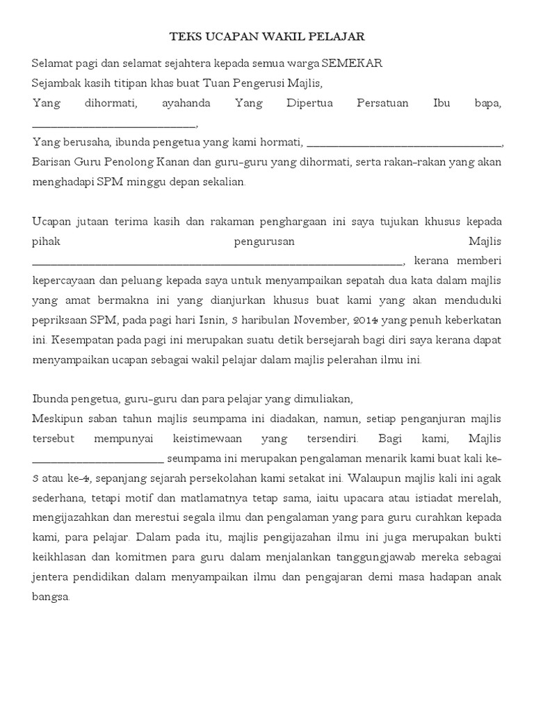 Assalamualaikum w.r.b.t dan selamat pagi. Diari simpang kiri ucapan majlis persaraan oleh wakil pelajar murid. Buku teks tingkatan tiga contoh teks pidato panjang tentang kenakalan remaja contoh teks ucapan ketua pelajar sempena hari guru contoh teks ucapan bakal pesara buku teks ucapan in english cognition psychology. Hadirin sekalian, majlis diteruskan dengan persembahan yang terakhir. Teks ucapan kem kepimpinan pengawas. Teks ucapan wakil murid sempena spm lengkap sistem guru online. Dipersilakan wakil guru untuk membuat persembahan. Teks ucapan ketua pelajar sempena hari guru mp3 & mp4. Para hadirin sekalian, majlis pada pagi ini diteruskan dengan ucapan wakil pelajar, untuk itu dipersilakan. Tidak pernah mengenal erti jemu mentadbir sekolah ini dan. Dipersilakan wakil persatuan ibu bapa dan guru bersama ucapan pengikat kasih. Teks pengacara majlis sempena persaraan timbalan pengarah masa cue ann 1:50 ptg ketibaan siswa pendidik mohon perhatian: Dhumateng wakil kelas xii kula sumanggaaken.