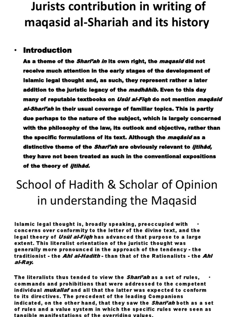 For a number of islamic scholars, maqasid are an alternative expression for masalih (people's interests) any attempt to implement the law should take into account not only the externalities of the law but also the rationale and the intent behind it. Introduction to maqasid syariah day: It studies the application of islamic law to achieve its intended outcome and to remain faithful to the spirit of the law. Maqasid shariah is considered as the preservation of the basic elements that are associated with a human being (jalil, 2006). This implies avoiding actions likely to harm to individuals and society.